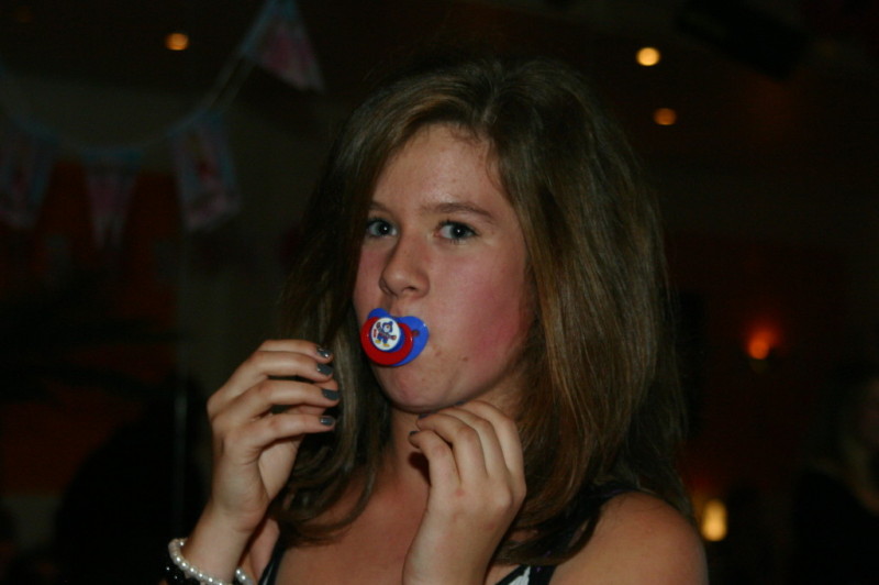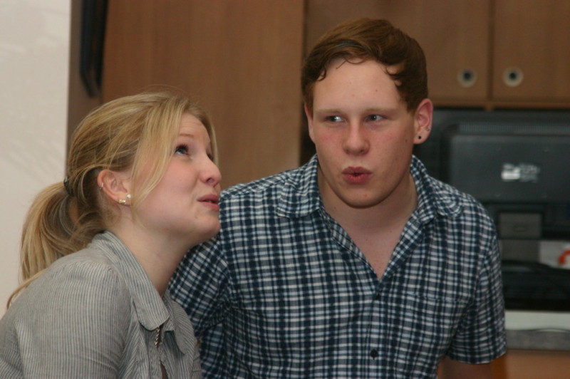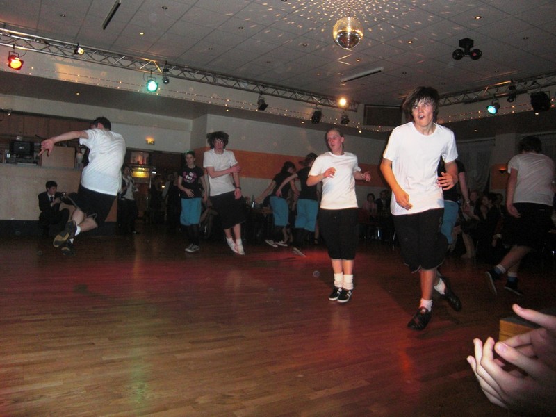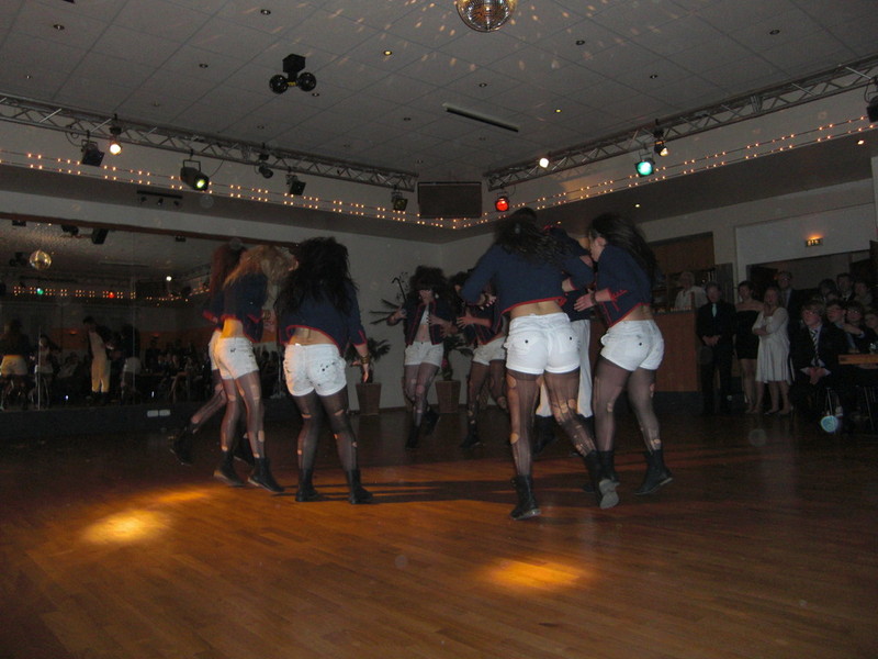 Kurzerhand sprang Norbert Janzen ein und übernahm, als etwas 'älterer Junge' den Platz des 2. Tänzers. Ein Paar passende Schuhe wurden dann noch im Kostümfundus aufgetrieben. Und so legten die beiden 'Jungs' unter dem Jubel des Publikums einen flotten Jive auf Parkett. - Also: Maren hatte ihre Saalwette verloren und musste nun einen Wetteinsatz abliefern. Sie erklärte sich bereit, bei der nächsten Jugend-Tanzparty den Getränkeservice zu übernehmen und die Gäste zu bedienen!