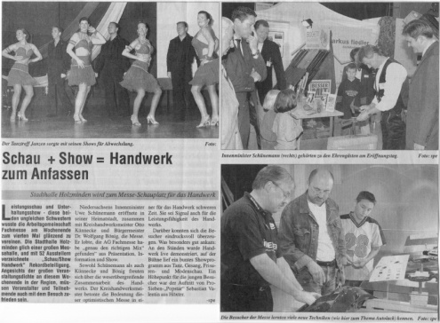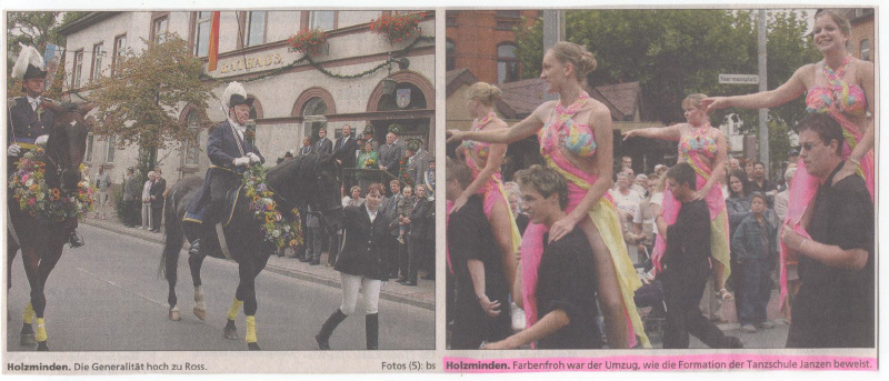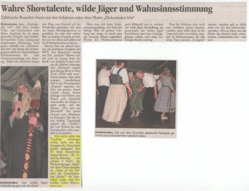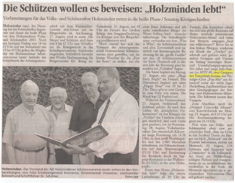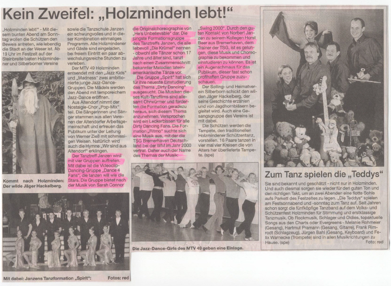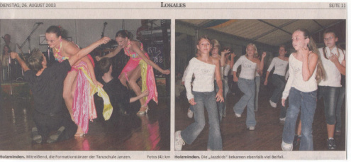 SF 20.08.2003 - In der Vorankündigung für das Holzmindener Schützenfest war unser Tanztreff ganz groß vertreten. Auf dem Foto des ersten Artikels, aus dem Schaufenster vom 20. August, ist die Formation "Spirit" zu sehen.