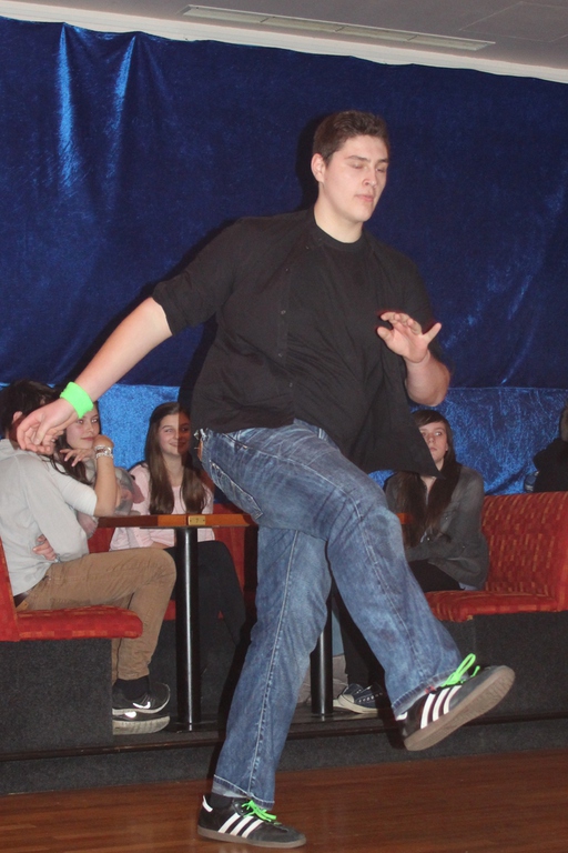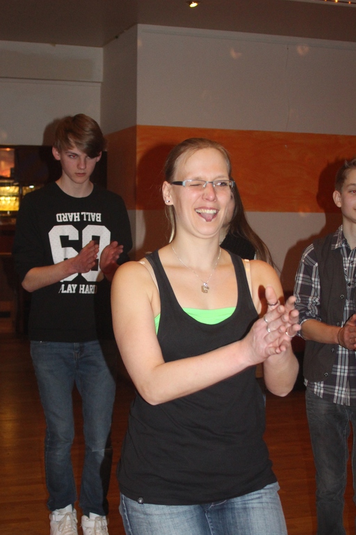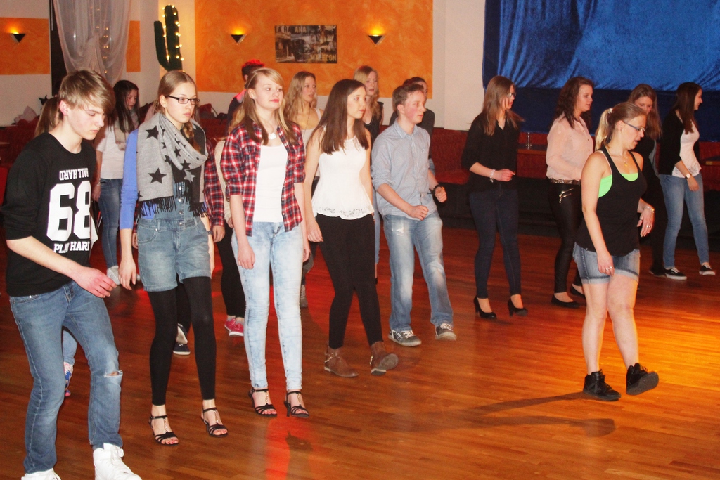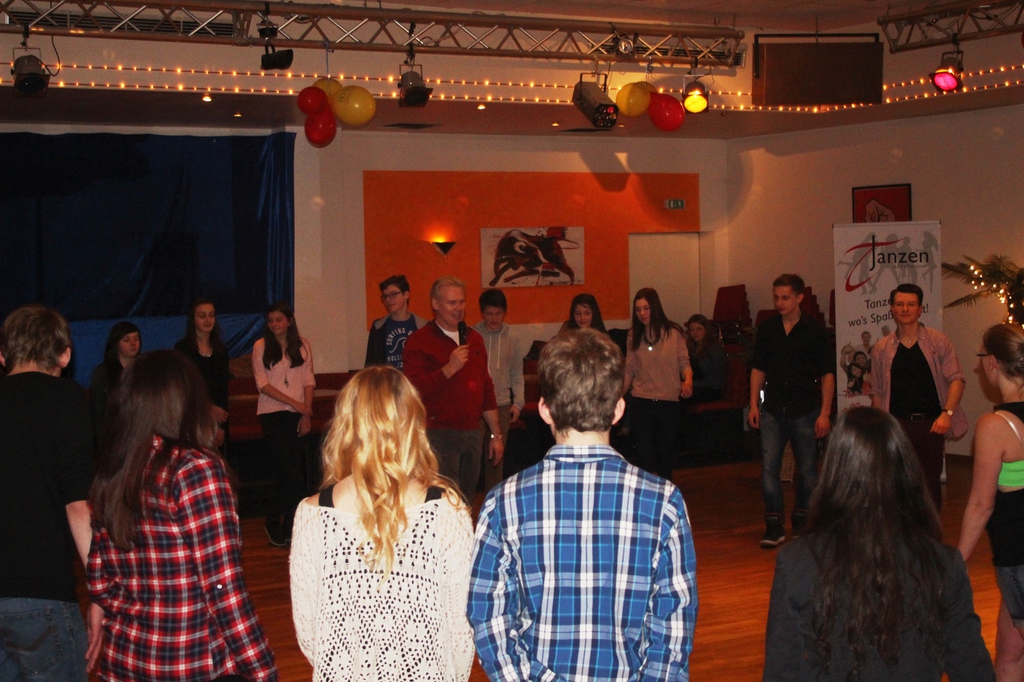 Nachdem sich die zukünftigen Tanzschüler alle Tänze, die ihnen von den Fortgeschrittenen Jugendlichen gezeigt werden, angesehen haben, werden sie von Norbert Janzen selbst auf die Tanzfläche gebeten und studieren gemeinsam einen kurzen